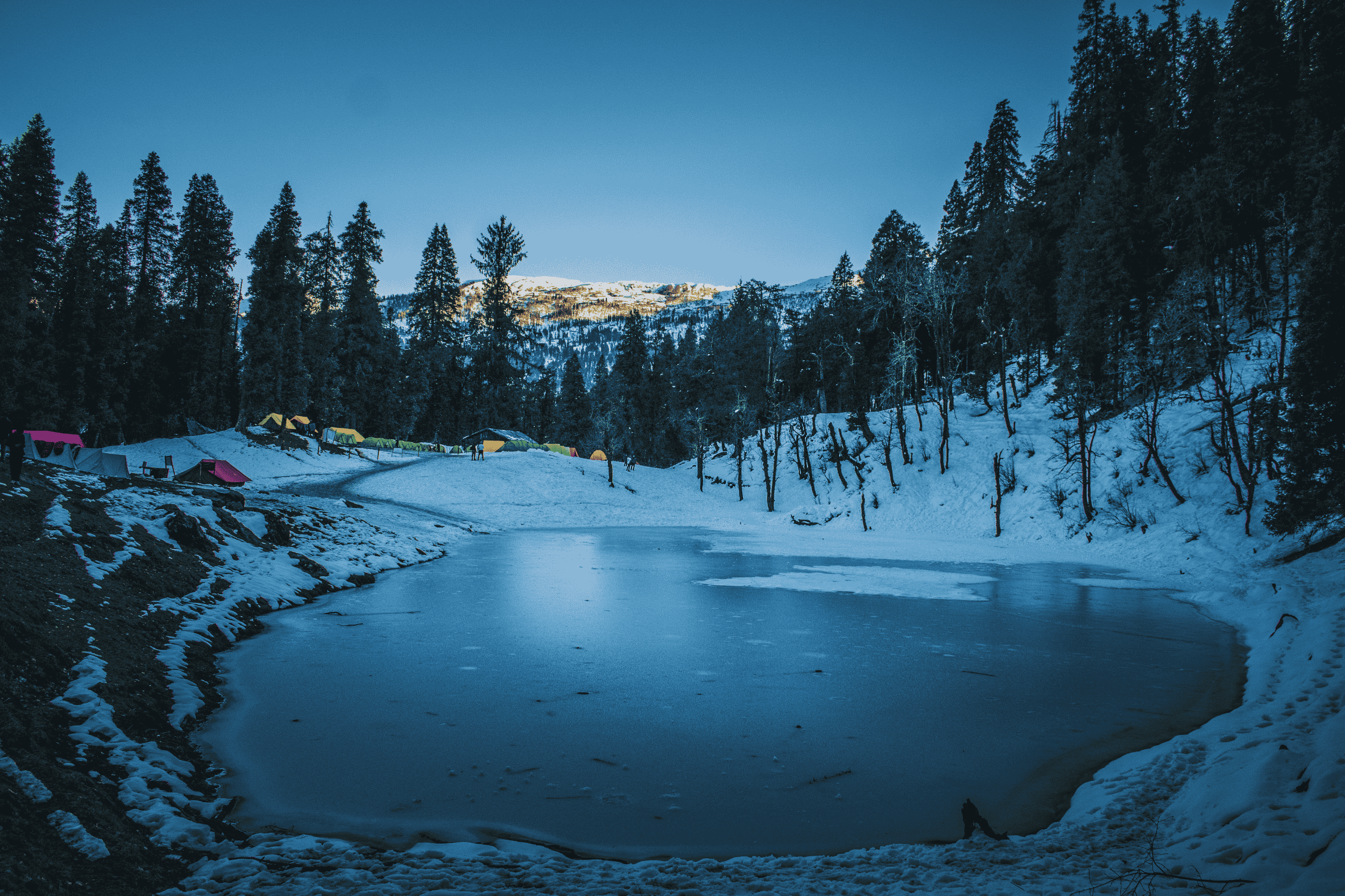 The trek begins with a gradual climb into dense forests of pine, maple, and oak. The sound of chirping birds and the crunch of snow underfoot (in winter) makes this stretch magical. As you ascend, the trail opens into a beautiful clearing with views of snow-covered ridges. Soon, you reach Juda Ka Talab, a mystical lake said to have mythological significance. In winter, the lake remains frozen, reflecting pine trees like a mirror. The campsite here offers a serene environment for your first night under the stars.