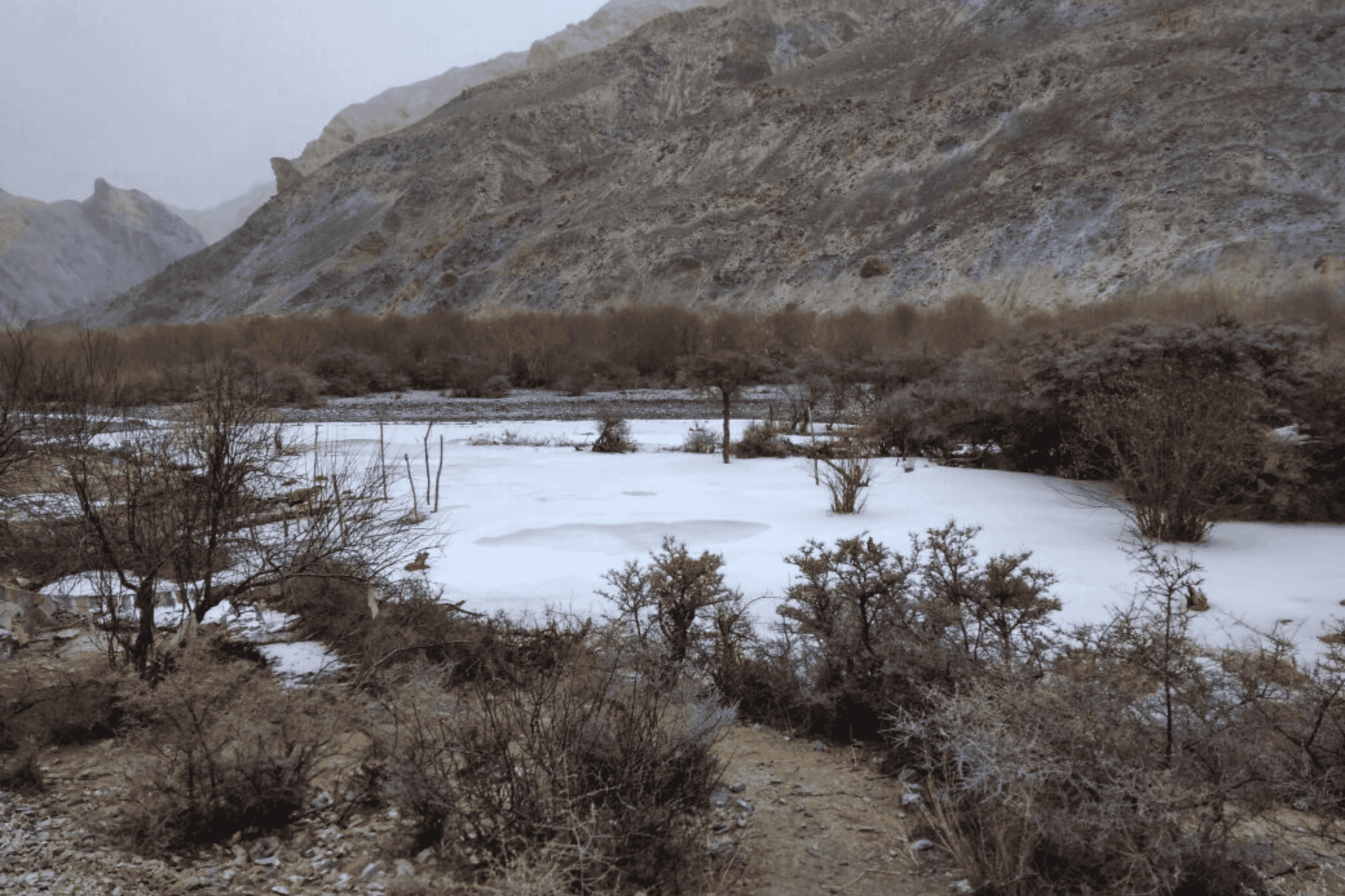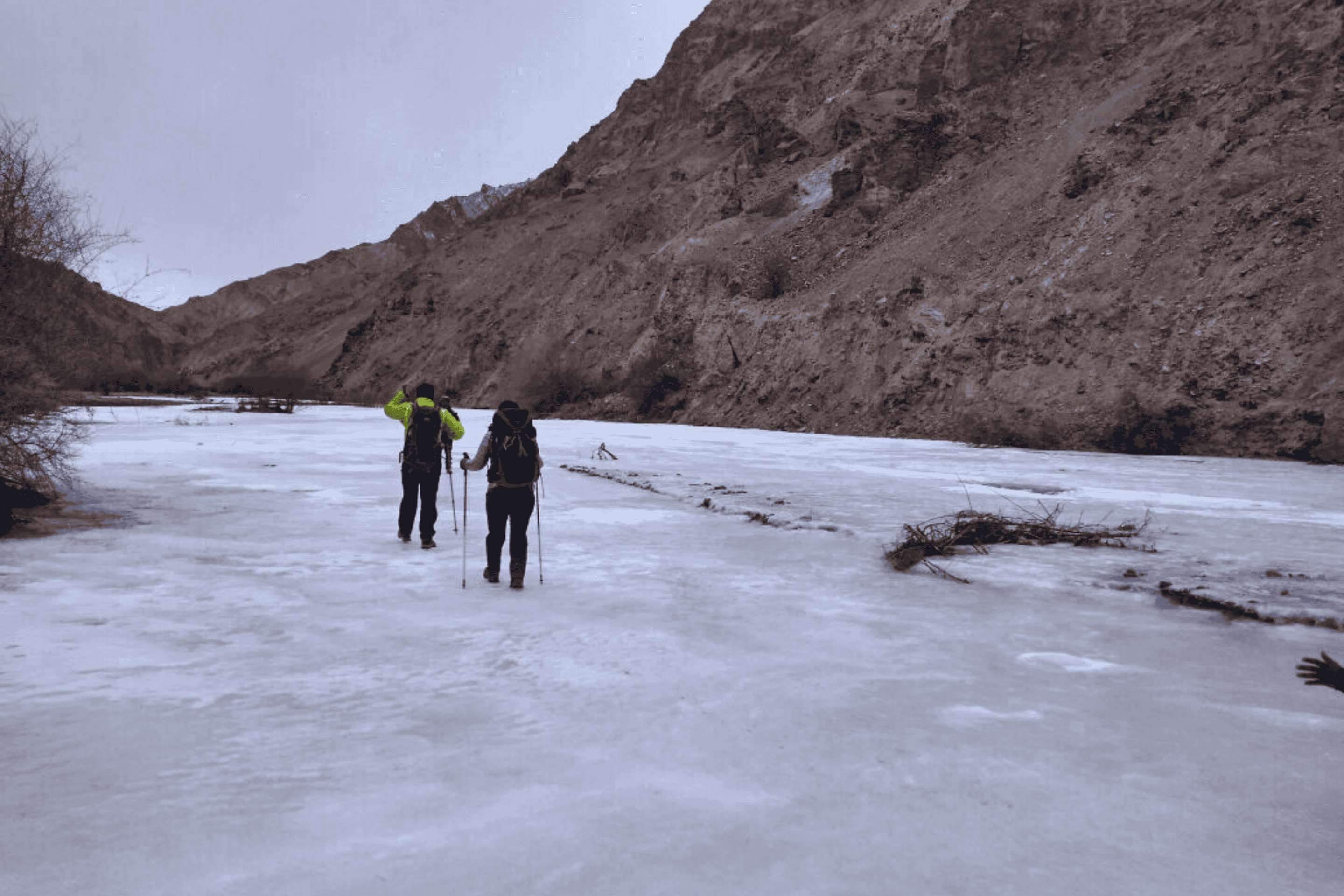 The journey proper begins with a dramatic drive along the frozen Indus River, its surface marbled with extraordinary ice formations. At Skiu, you meet the frozen Markha River – your highway into the valley. The trek to Sara follows the ice-covered riverbed, your micro spikes crunching rhythmically on the frozen surface. The sound of the ice groaning and cracking beneath your feet becomes the soundtrack to your journey. Winter has stripped the landscape to its essentials: bare poplar trees stand like skeletons against the blue sky, frozen waterfalls create surreal ice sculptures on canyon walls, and the only signs of life are the tracks of snow leopards and foxes crossing your path. Arriving at Sara as the winter light fades, you experience your first true winter camping – setting up tents on snow, melting ice for water, and learning the crucial skill of keeping your gear dry in sub-zero temperatures. The temperature plummets to -20°C after dark, making the simple act of boiling water an accomplishment.