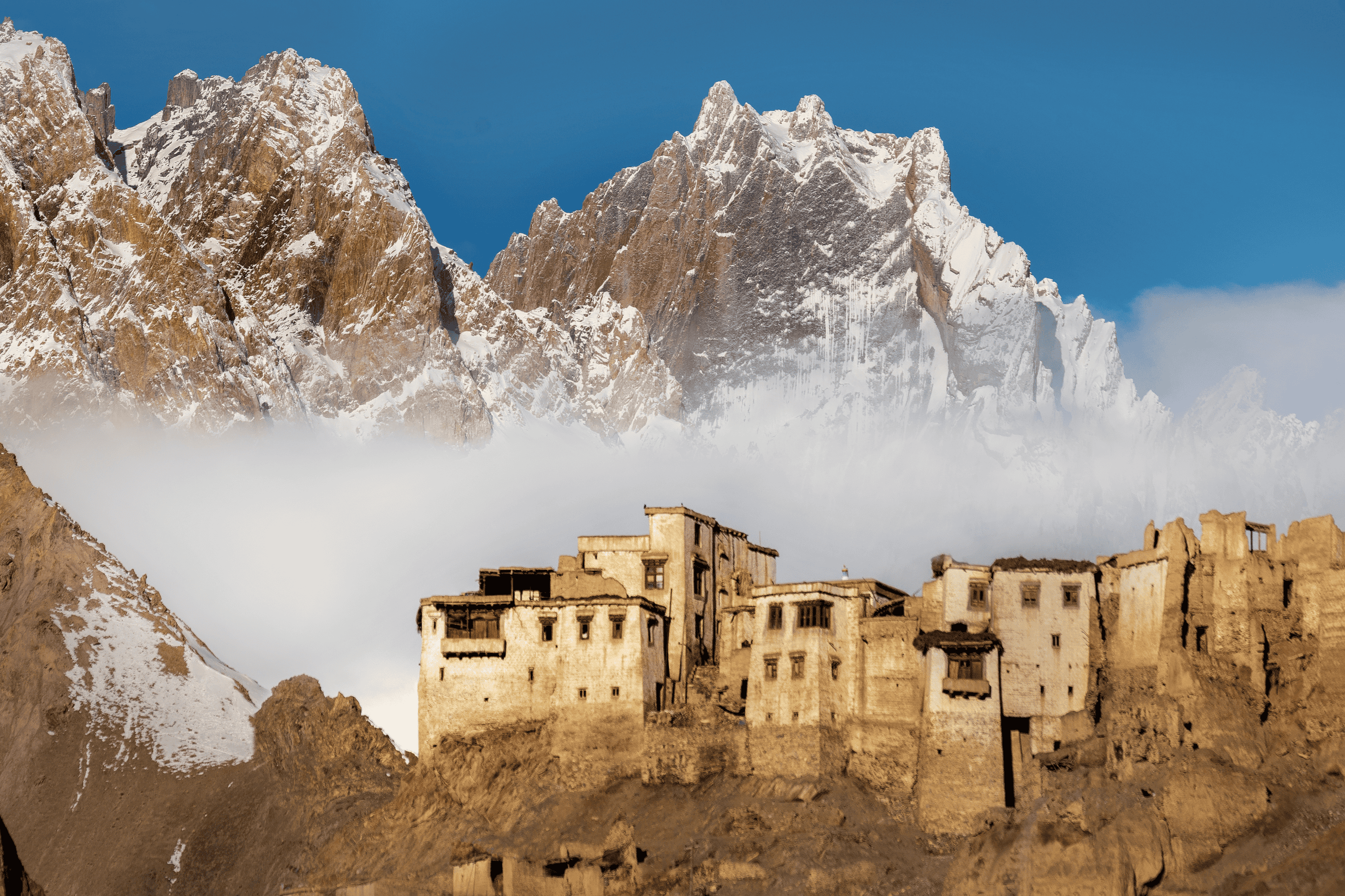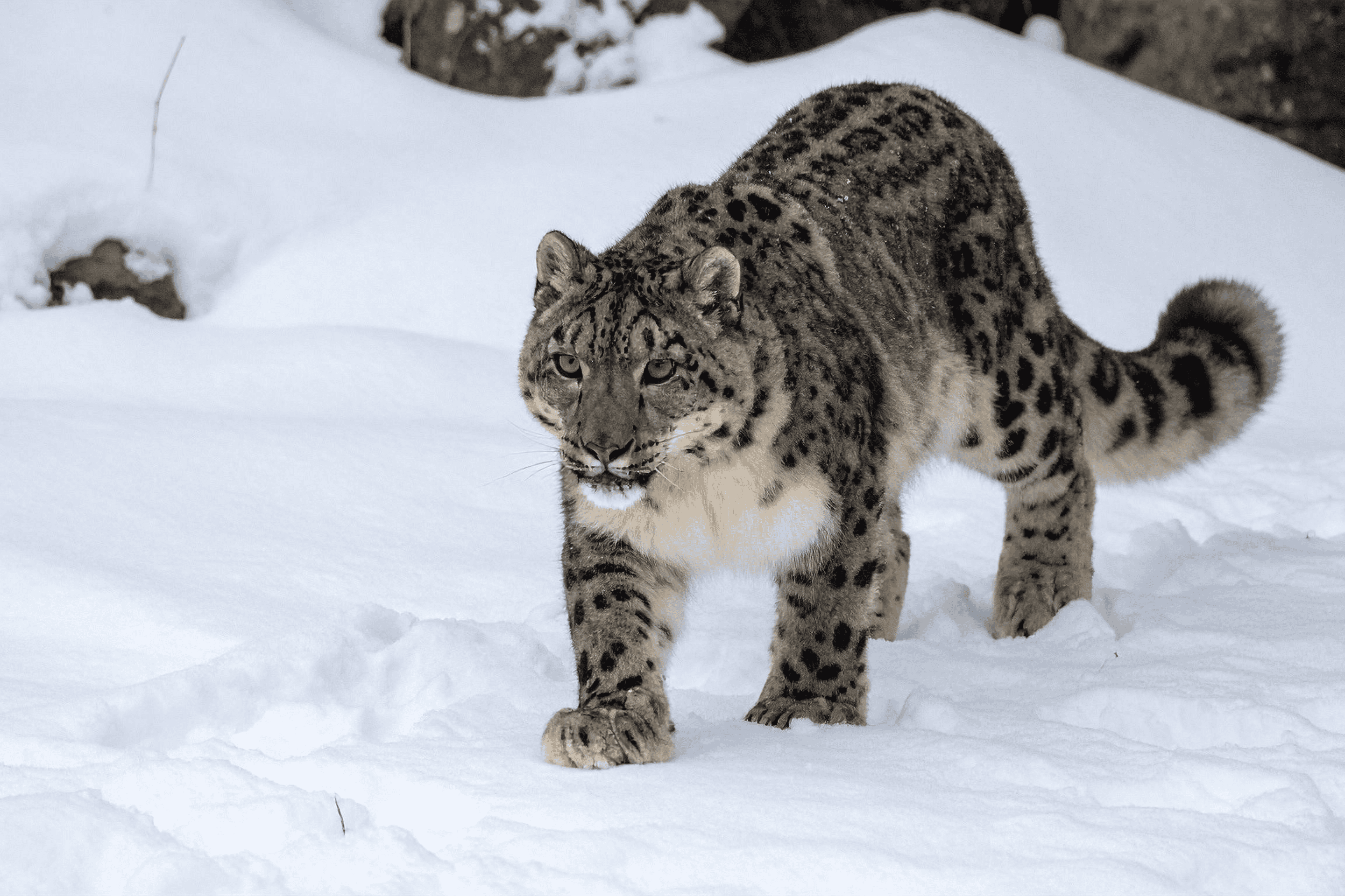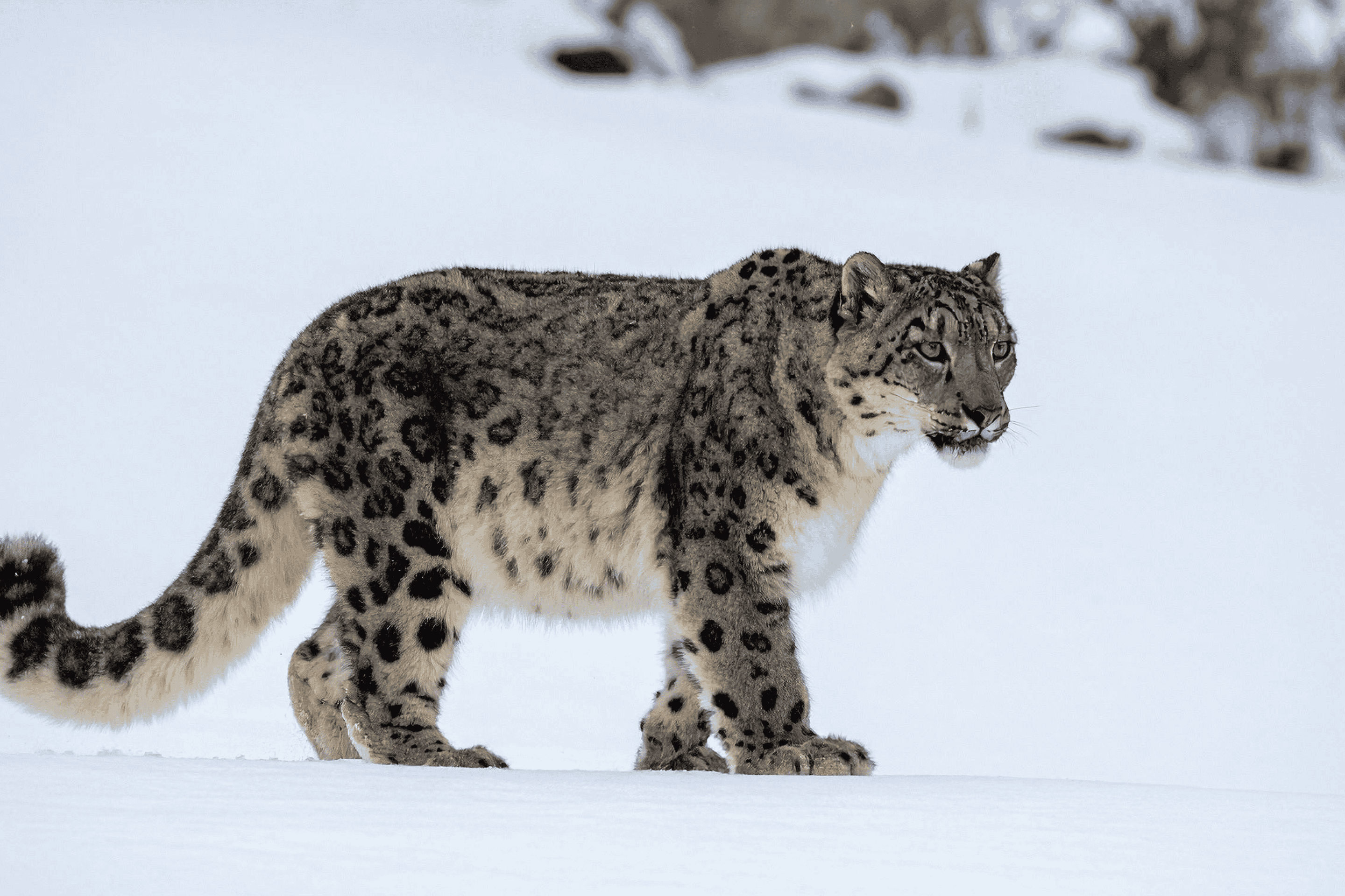 The ideal season is winter (December to March), when snow leopards descend to lower altitudes, increasing the chances of sightings amidst a pristine snowy landscape.