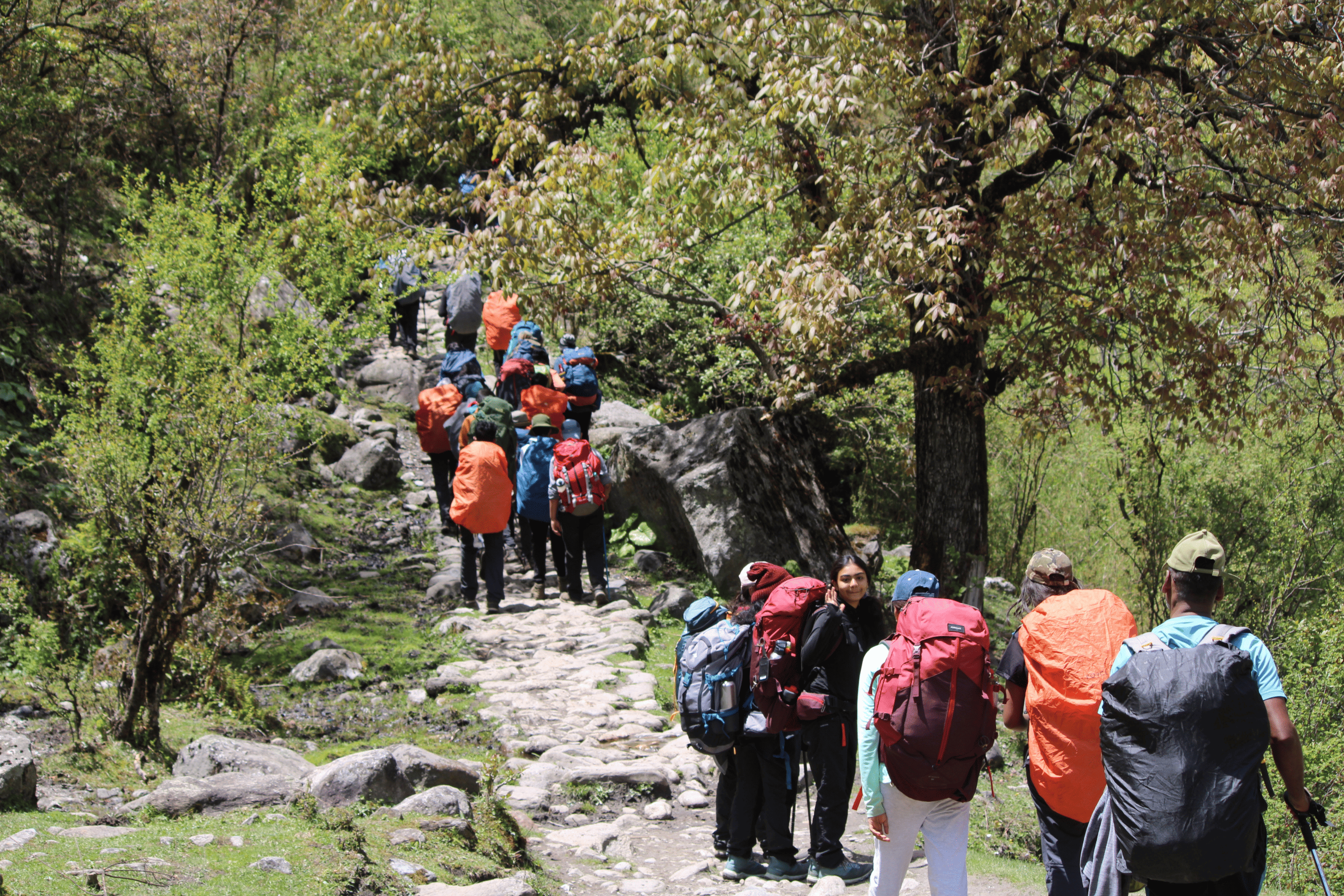 The trek begins with a steady ascent through dense oak and rhododendron forests. The trail offers expanding views of the valley as students gain elevation gradually.